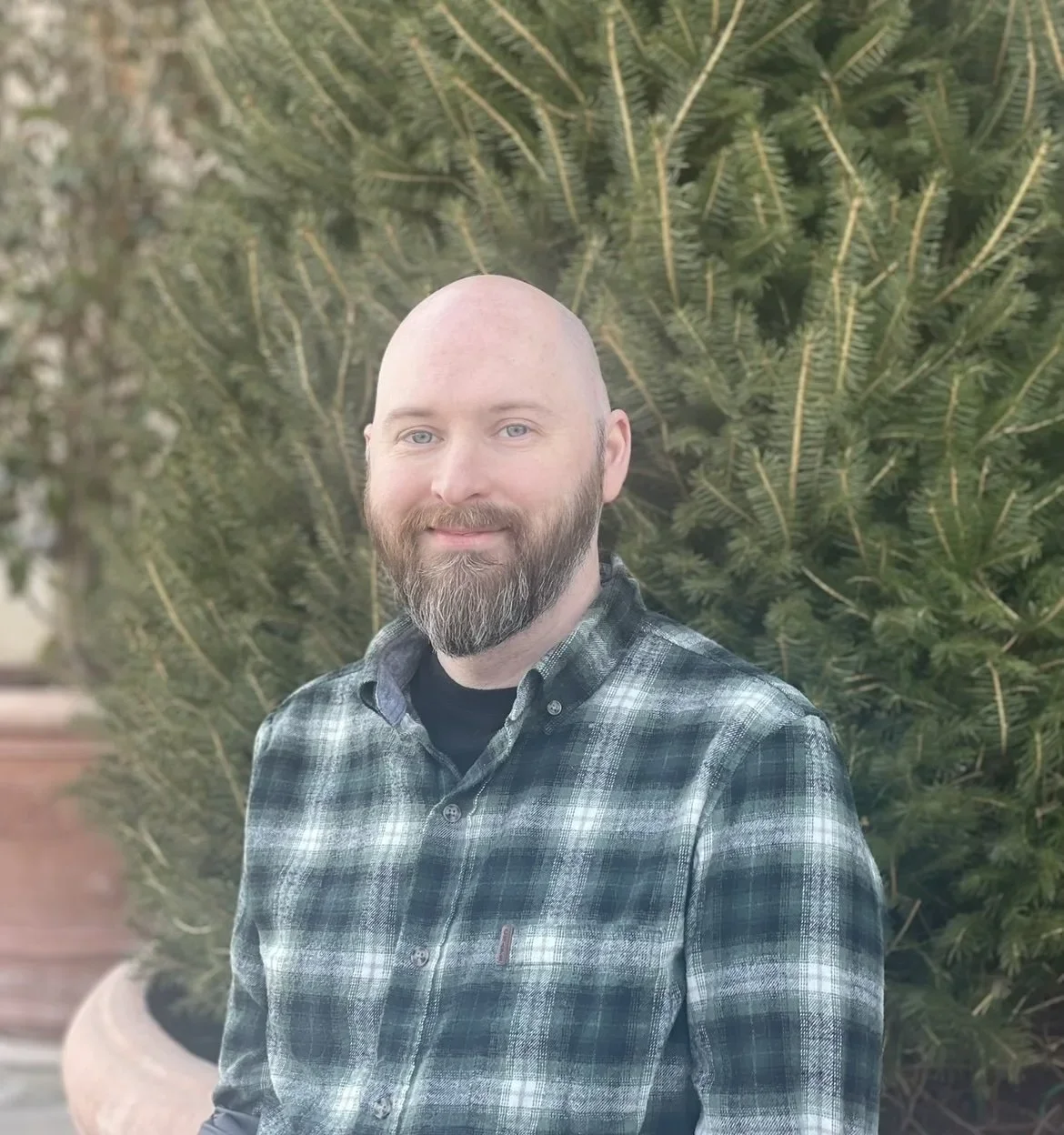 A man with a beard and bald head smiling, standing outdoors in front of a large green plant with pine-like foliage, wearing a green plaid shirt.